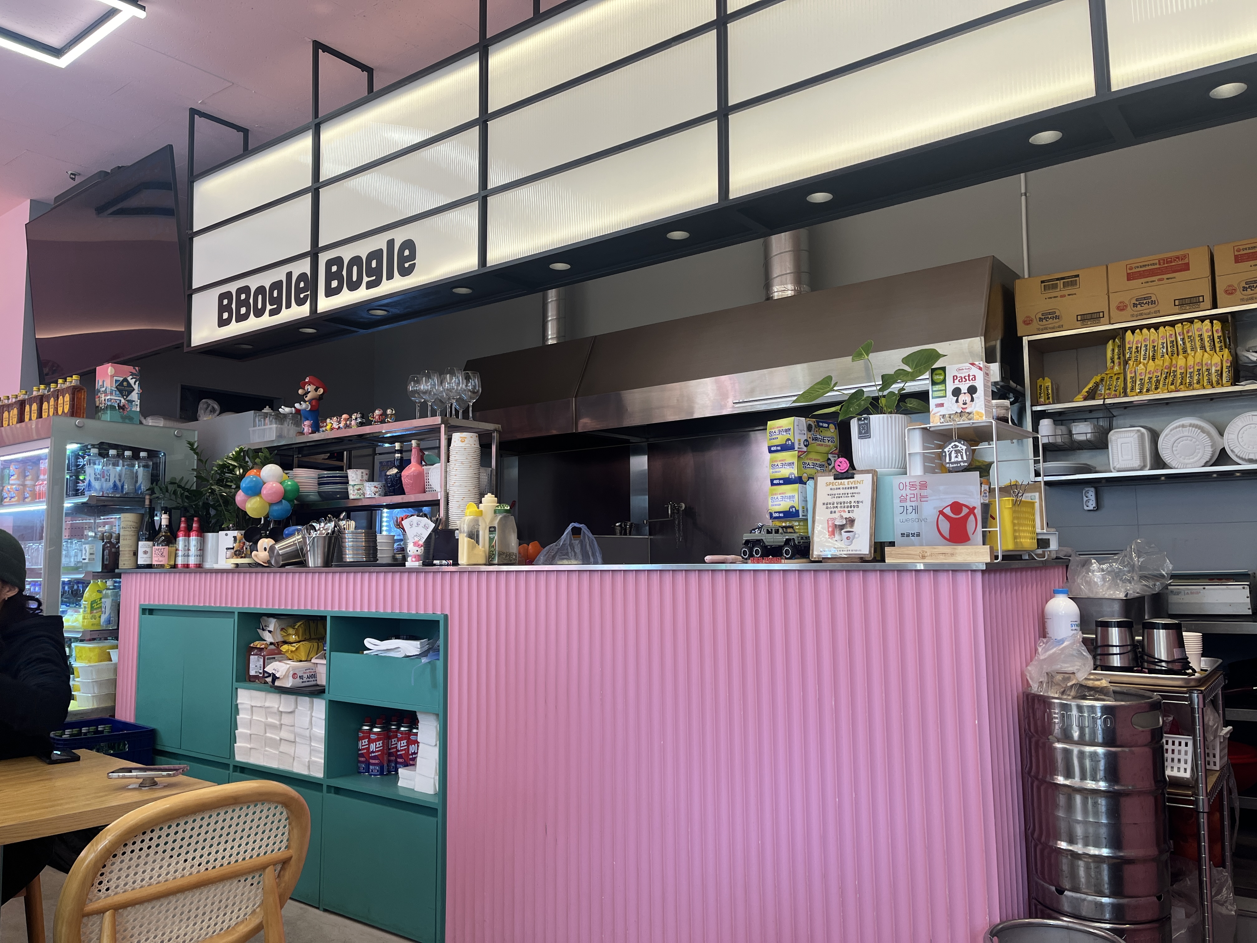 인테리어가 분홍분홍 아기자기하고 벽 한쪽에는 피규어 장식이 잔뜩 있습니다.